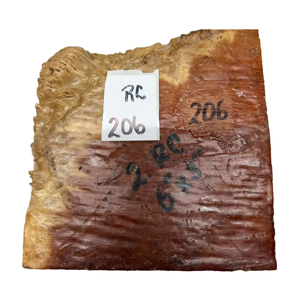 Red Coolibah Burl wood, sourced from the burls of the Red Coolibah tree (Eucalyptus coolabah) indigenous to Australia, boasts a remarkable array of specifications that make it a prized material for woodworking and crafting. This wood exhibits a rich reddish-brown color with variations in hue, ranging from deep crimson to lighter reddish tones, lending it a distinct and captivating aesthetic appeal. Its grain patterns are equally remarkable, characterized by intricate swirls, marbling, and irregular figuring, resulting from the unique growth patterns of burl formations. Beyond its visual allure, Red Coolibah Burl wood is known for its exceptional hardness and durability, with a high density that contributes to its resistance to wear, impact, and decay. This density also provides a satisfying weight and substantial feel, enhancing the perceived quality and value of products crafted from this wood.